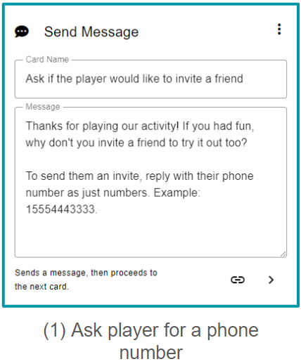 This example would send to the phone number +1-222-333-4444 from the current integration. (For example, to give a heads-up to a facilitator that a player has arrived at the library, so they can walk over and say “hi!”.)