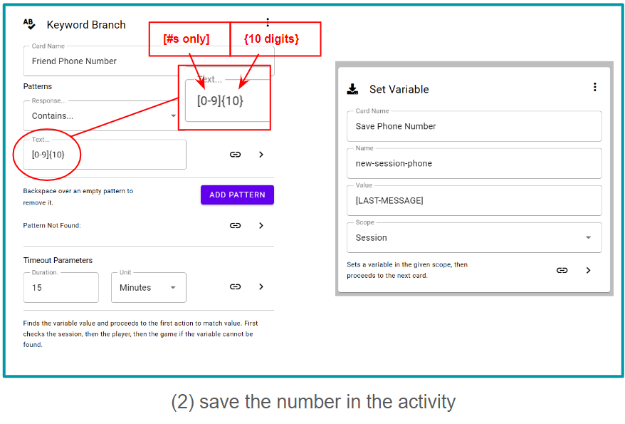 How do you get to this editor? On the Send Message card, click the three dots for ‘advanced’, and fill out Destinations with the phone number(s).